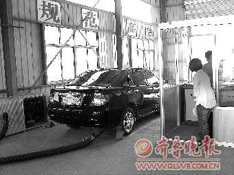 在莱芜鑫隆机动车检测有限公司,厂区北侧就是公安部门安检线,紧挨着安检线的是尾气检测线。一辆私家车安检结束后,紧接着进行了尾气检测,整个过程用时约20分钟。