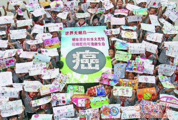 30日,枣庄市市中区回民小学学生用烟头制成禁烟警示牌。今天是第24个世界无烟日,也是我国自5月1日起实施“室内公共场所禁烟”后的第一个世界无烟日。