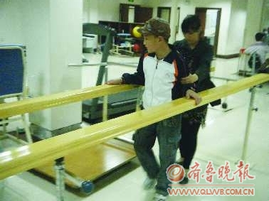 30日下午,在康复治疗室中,小赵伟正在母亲陈克花的帮助下扶护栏走路。赵伟的左腿一瘸一拐,采访中,他一直用右眼看记者。