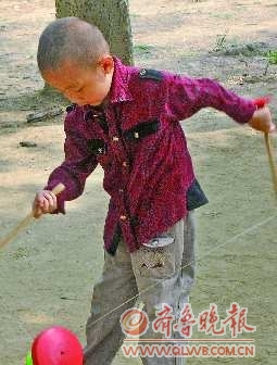 每个周末,在济宁仙营绿地的西北角,总会看到几位空竹爱好者竞相玩空竹的场景。其中,一个幼小的身影特别引人注目,他一会沿丝,一会上杆……引得围观者阵阵掌声。他就是绪邱,今年4岁,是2011中国·保定空竹艺术节个人展示二等奖的获得者,也是全国最小的一名空竹表演选手。