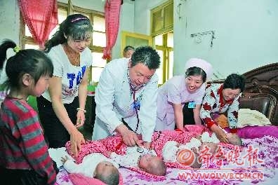 27日,济医附院专家为汶上县后周村五胞胎进行健康体检。据悉,当日专家们先后前往梁山县拳铺镇、汶上县后周村,为在医院顺利分娩的两例五胞胎进行健康体检,并为他们带去了“六一”儿童节礼物。经儿科专家仔细查体,两例五胞胎身体状况良好。 本报通讯员 高爽 摄