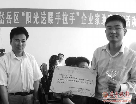 作为助残月的系列活动之一,岱岳区开展了“阳光送暖手拉手”企业家助残联谊活动,现场募集善款5万余元。图为残联工作人员向爱心企业家颁发表彰证书。
