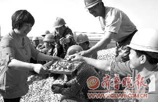 端午节即将到来,乳山市城区街道办组织社区的工作人员开展了“真情关爱身边人、粽子送给农民工”活动。29日,46名社区工作人员来到周边12个旧村改造工地,将自己亲手包的粽子和煮熟的鸡蛋送给农民工,和他们一起欢欢喜喜地迎接端午节。 本报记者 刘洁 通讯员 仝庆凤 李广峰 摄