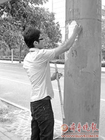 30日上午,志愿者张金榜在渤海八路清理电线杆上的小广告。张金榜告诉记者,他单位出动了十几位工作人员清理人行道和电线杆上的小广告,用自己的一点力量为创城奉献一份力量。