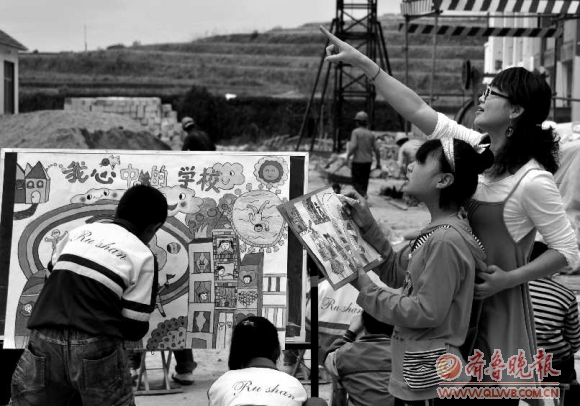近日,乳山市午极镇中心小学的学生在老师的指导下绘画着自己心中的学校。儿童节前夕,午极镇中心小学的教师组织学生在新建学校工地远处上了一堂主题为“”的社会实践课,小学生们用五颜六色的彩笔绘画着自己心中的学校,并将彩画作为儿童节的礼物在同学间互赠。据了解,乳山市今年共投资1.9亿元在农村新建了两所九年一贯制学校,并对全市8个镇的农村学校按照省级规范化标准全部进行改造,总建筑面积达3.7万平方米,预计9月新学期开始正式交付使用,这是农村孩子期盼已久的梦想。 (段鹏 张海凤)