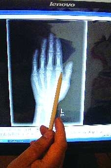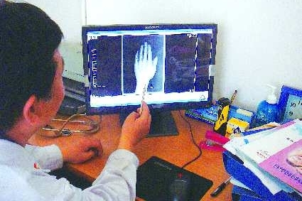 嵇主任在查看患者骨龄检查结果,骨骺是否封闭是患者长高的重要因素。