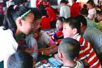 “爸爸,你看他们这里也有图书角啊。”小记者林欣潞发现教室的角落里有一个旧书柜,里边有一些旧书。“没想到这里也挺重视学生课外阅读的嘛,还建了个图书角。”林欣潞的父亲高兴地来到图书角观察了起来,可是现实情况却让他大跌眼镜:“这个图书角里怎么全是些大人看的书籍呢?”记者了解到亭口小学的学生们课外读物很少,图书角里能读的书也很少,平常学生家里也很少买课外读物给孩子看。小记者林欣潞得知情况后难过得差点掉眼泪:“没想到他们和我差别这么大,我家里那么多书,想看什么就买什么,和他们相比我幸福多了,我要把家里看过的书都邮过来,也发动同学们一起,给他们建立一个真正的读书角。”