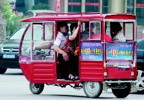 30日,在向阳路上,一辆载客三轮车连大人带小孩塞进7个人,由于车厢里实在挤不下去了,其中一人被人抱着探出车门,险象环生。