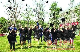 5月31日,山东大学学生跳跃着将帽子抛向空中。又逢毕业时,很多大四学生摄影留念,告别四年的大学时光。