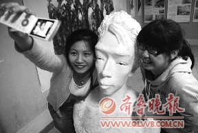 5月30日,在青岛大学剧院,一名雕塑专业的毕业生给自己的同学做了一件雕塑作品,两名低年级的学妹正在跟其合影,留作纪念。当日,该校美术学院2011届的32名硕士研究生的近百幅美术毕业创作及艺术设计作品展出。本报记者 张晓鹏李珍梅 摄影报道