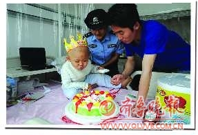 “六一”前夕,青岛开发区辛安派出所社区民警刘航、朱静来到医院,看望这个已与白血病斗争了两年的“小英雄”。