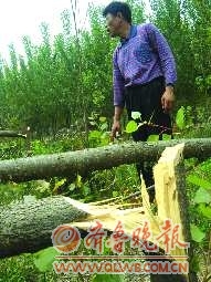 5月31日上午,在胶南市隐珠镇董家庄村4户村民承包的土地上,成片的杨树和松树倒在地上,树干位置有明显的折断痕迹,因为脱离地面时间太长,树木枝叶已经泛黄。自家树木被砍的村民隋宾友告诉记者,被砍掉的树共有近两万棵,是在5月13日、14日、16日、20日和26日的晚上被人砍断的。