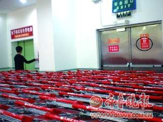 30日,在海滨北路一家超市,常闭式防火门上标有“紧急出口,请勿阻塞”的警示,但安全门却被超市购物车牢牢堵死。