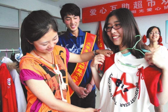 大二数学专业的姚玉萍告诉记者,现在有了爱心超市,一些不穿的衣服和不用的书籍可以捐赠,以便有需要的同学使用。大家也可以来翻阅一些图书资料,不用再花钱去买了。大四土建专业姚树典告诉记者,书籍当废品卖掉很可惜,又卖不了几个钱。马上就毕业了,还有很多事要处理,也没那么多时间。现在有了爱心超市,可以捐赠了。