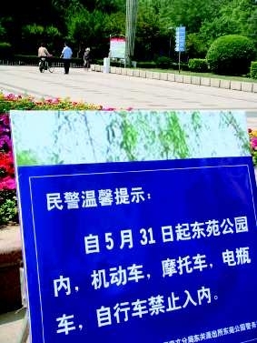 本报5月31日热线消息(记者董惠)近日,有市民反映,东苑公园里车辆“扎堆”,不仅影响公园环境,还给游园游人造成安全隐患。5月31日,奎文园林部门在公园入口处贴出通知,即日起,东苑公园内,机动车、摩托车、电瓶车、自行车禁止入内。