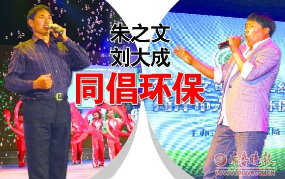 5月31日,“大衣哥”朱之文(左)与《星光大道》2010年度冠军刘大成(右)登上“2011菏泽市六·五环保文艺晚会”舞台,呼吁市民关爱环境。晚会现场,单县农民歌手朱之文演唱了《夕阳红》、《滚滚长江东逝水》,济宁农民歌手刘大成演唱了一首《父亲对我说》,既感染了现场观众,也把环保理念唱到了市民心里。据了解,6月5日就是世界环境日,今年世界环境日中国主题是“共建生态文明,共享绿色未来”。 本报见习记者 李贺 摄影报道