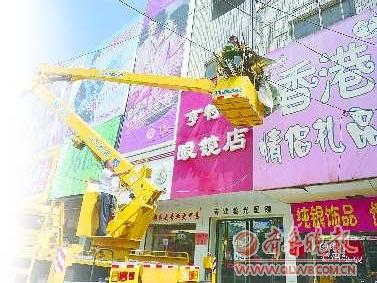 本报菏泽5月31日讯(见习记者 刘彩丽) 5月31日上午,东方红大街违章广告牌清理工作正在紧张进行。据悉,此次清理工作主要针对东方红大街不少商铺存在的双门头、多门头、破旧门头等现象,以消除违章广告牌存在的安全隐患,树立良好的城市形象。