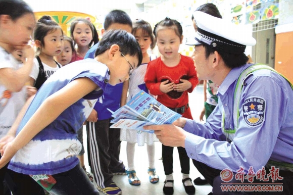 5月31日,泰安市交警一大队二中队民警走进辖区八一幼儿园,通过图画的形式向小朋友们介绍了交通安全常识。