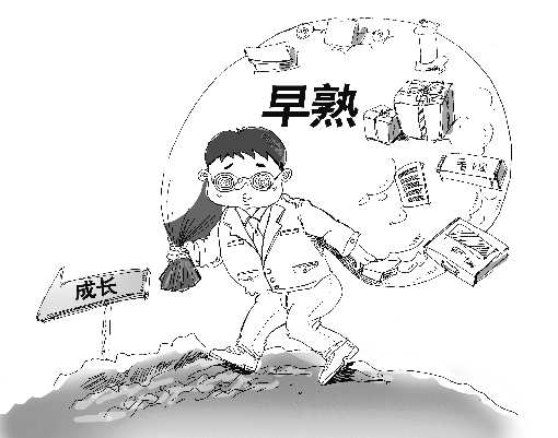 童年还在,在大人的回忆里,在70后、80后怀旧的歌声中。童年已经没了,因为当今社会,已经不允许一个人有太长的童年。成人化的儿童新闻无孔不入地冲击着公众的眼球。“官样小大人”黄艺博,奥运小童星林妙可的“丰胸”风波,成都一名7岁女孩为了能当班级舞蹈的领舞,央求妈妈去“走后门”,原因是她知道妈妈和班主任是同学;听说爸爸因交通违章被开了罚单,需要重新去学交规,一个不满10岁的孩子说出的话令父母震惊:“你们送点礼给警察不就不用学习了”……在这种近乎癫狂的热闹之余,我们熟悉的那个童年却日渐模糊起来。当年轻一代们提前进入怀旧期的时候,今天的孩子又都在过着怎样的生活?早熟的童年不再天真,他们被过早的“催熟”。 (国际先驱导报)