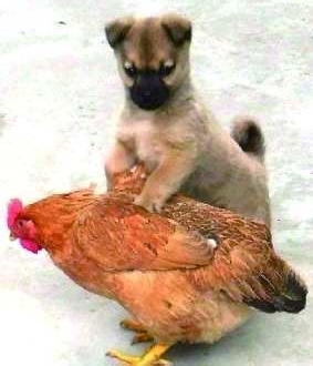 作品描述:刚出门就碰到一只鸡被一只狗欺负,酷似“缴枪不杀”的动作。