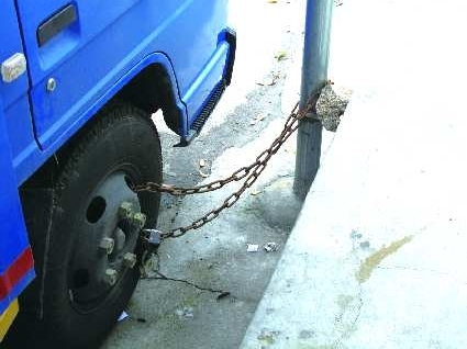 作品描述:一辆货车的车轮竟用铁链与柱子锁在一起。