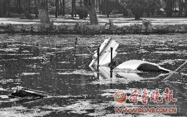 本报济宁5月31日热线消息(记者 黄广华 见习记者 韩伟杰) 去年7月的一场大雨让停留兖州市城区少陵公园的湖面上的36艘游船全部沉入湖底(如右图),在将近一年的时间里,游船的船主一直没有打捞,而公园的管理部门也没有对沉船进行处理。