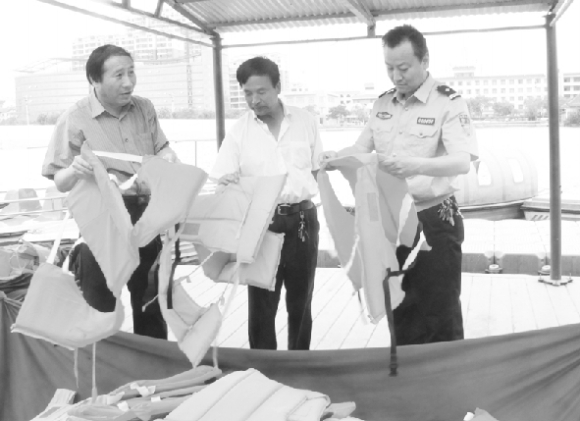5月31日,水城集团组织东昌湖派出所、综合治理大队和运河公司、物业公司等组成检查组,对东昌湖风景区内近20组大型游乐设施和300余艘船只进行安全隐患大排查,并限期对运河博物馆南侧废弃游乐设施进行拆除,对于短期内不能拆除的,在“六一”期间,物业公司派专人现场管理。图为水城集团副总经理张小林(左一)带领检查组工作人员在查看救生衣。