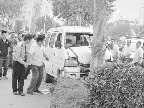 31日下午4时10分,记者赶到兴华西路事发地点发现,一辆面包车车头严重受损,前挡风玻璃破碎,面包车右前门附近的地面上有擦过血的纸。现场一位环卫工说,当时这辆面包车自西向东行驶,突然冲进路南的花坛,直到撞到路边一棵大树后才停下来。
