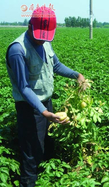 2日上午,记者在前往胶州市土豆主产区胶西镇的路上看到,路边的地里种的全是土豆。而胶西镇张家小庄的菜农贺桂运此时正在忙着给自己的8亩土豆田浇水。“今年冬天冷,转过年来又赶上天旱,原来半个月浇一次水的土豆现在隔个四五天就得浇。”贺桂运说,胶西镇每年都会在5月土豆收获的时候举办“土豆节”,那个时候来自南方的客商也会设置收购点大批量收购土豆。可今年因天气原因大田土豆延期收获20多天,不光“土豆节”没举行,以往的那些客商现在也不见人影。 胶西镇苑戈庄的村民苑先生长期为南方客商收购土豆、为胶州市的众多农户提供土豆种子,他告诉记者,今年全市土豆种子的使用量是去年的三倍多。胶北镇、马店镇、胶莱镇等以前种植粮食、花生的土地,现在也都种上了土豆。苑先生说,往年这个时候,广州、浙江等地的几个客商就会主动打电话和他联系,商量收购土豆事宜。可今年对方迟迟没动静,苑先生见状便主动打电话联系客商来,可对方却一直说等等,不说要来,也不说不来。