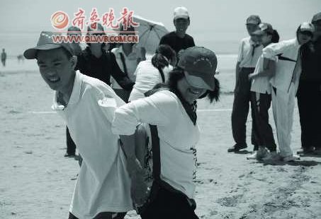 2日,在石老人海水浴场,来自三江学校的孩子正在和家长做“螃蟹跑”传球游戏。当日,市智协组织岛城200余名智障人士、及其亲友以及志愿者来到浴场参加“传递爱”亲子运动会。目的是丰富智障儿童的家庭生活,给他们增添快乐。 本报记者 张晓鹏 王笑 摄影报道
