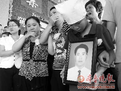 李学国的妻儿、亲属都站在灵堂的左前方,今年只有12岁的李振远,站在母亲徐景花的身旁,一边哭一边喊着“爸爸,爸爸”,徐景花的泪已哭干了。