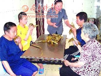 6日,端午节。在济南市救助管理站,受助人员围坐在一起品尝工作人员专门为他们准备的粽子。粽子让这些远离亲人的受助人员倍感幸福。 本报记者 邢振宇 通讯员 孙伟 摄
