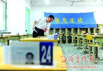 6日,一位工作人员在济南中学考点内检查考场,后墙上挂着“祝您成功”条幅。