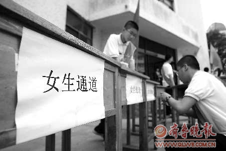 6月6日,烟台二中考场桌子上粘贴了带有“男生通道”和“女生通道”字样的白纸。据了解,今年烟台考生进场男女生要分开走。因为首次启用了金属探测仪,相关人员会对考生进行全身贴身扫描,男女工作人员分开检测。