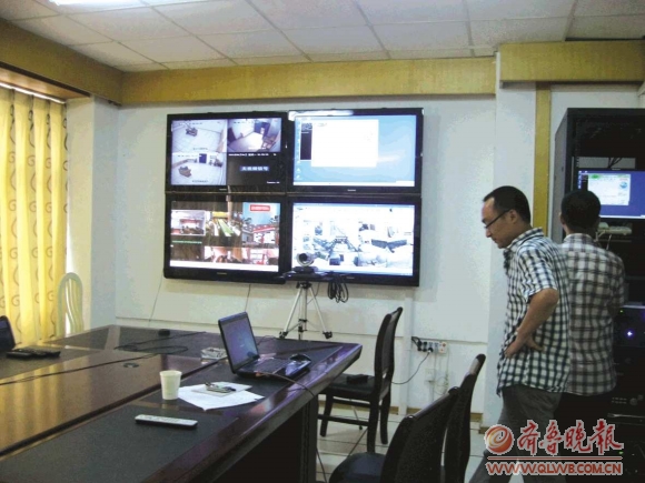 6日下午,记者走进招生办公室最里面一间办公室,只见墙上写着教育考试指挥中心几个字,对面墙上有四块显示屏幕,现场有三个工作人员正盯着显示屏观看情况。其中一名工作人员介绍,该套设备是今年最新应用的视频终端系统,系统和保密室内的监控相连接,从这里可以全天候监控到高考试卷的存放情况,以加强高考试卷的保密工作。