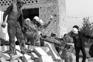 现场的工人和村民告诉救援人员,石料场内有起重的吊臂,平常用来搬运石料,可以作为牵引,只要把石料挪开,伤者的右腿就可以移出来。救援人员采取了大家的意见,并请工人们帮助找来钢缆和更多的木楔、圆木,做好救援准备工作。