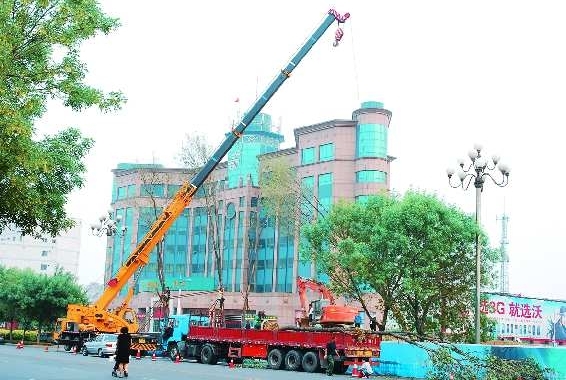 6月6日,在府前大街路旁,东营市园林处的工作人员正在栽种树木。据工作人员介绍,为创建文明城市,近期将在主要交通路段栽种各类树木、花草等来绿化城区。 本报记者 任小杰 摄影报道