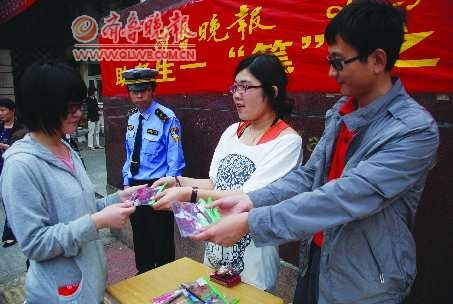 6日下午,在青岛19中,本报记者正在考场外设置的放心笔发放点免费向考生发放放心笔。为方便考生,当日,本报联合山东协和职业技术学院举办“助考生一‘笔’之力”活动,在青岛1中、青岛15中、青岛19中三个考场外向考生发放500余套放心笔考试包。