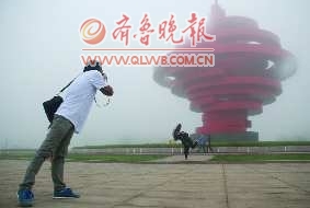 6日,在五四广场,来自青岛大学的一对情侣在雾中拍照留念。当日,岛城出现能见度不足百米的大雾,青岛市气象局发布了大雾黄色预警。