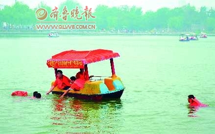吃粽子,赛龙舟,可谓端午佳节的必备节目。6日,德州市亿维数码广场为庆祝端午节,组织员工在新湖举行了一场赛龙舟比赛,不料夺得第一名的一名队员太过高兴不小心掉进了湖里,所幸并没有受伤。 本报记者 马瑛 摄