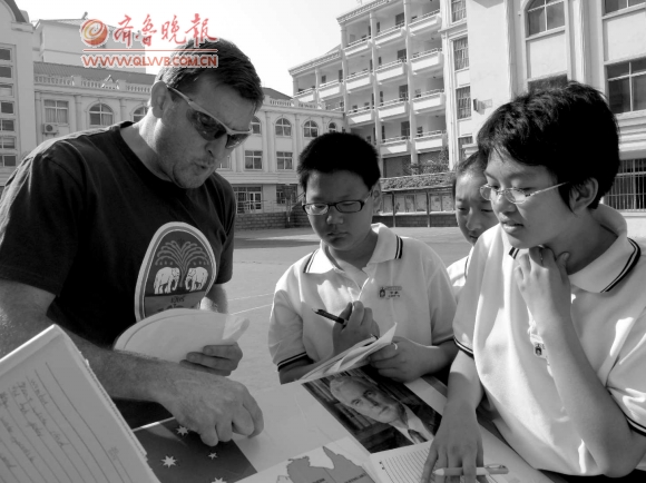 近日,环翠国际中学把英语中“纽约街”的场景搬到校园,如世博园、购物街、竞技场等,为学生创设一种工作和生活的环境。学生通过答题,赚得一部分购物基金,然后在购物街里买到自己喜欢的书、本子、玩具、水果等。通过这个活动,可以让学生在实际操作中运用英语,同时锻炼了学生们的交际与沟通能力。图为外教在给学生们出题目。 (王春丽)