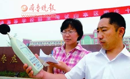 6月6日,枣庄市山亭区环保局工作人员在对一考点周边环境进行噪声监测。