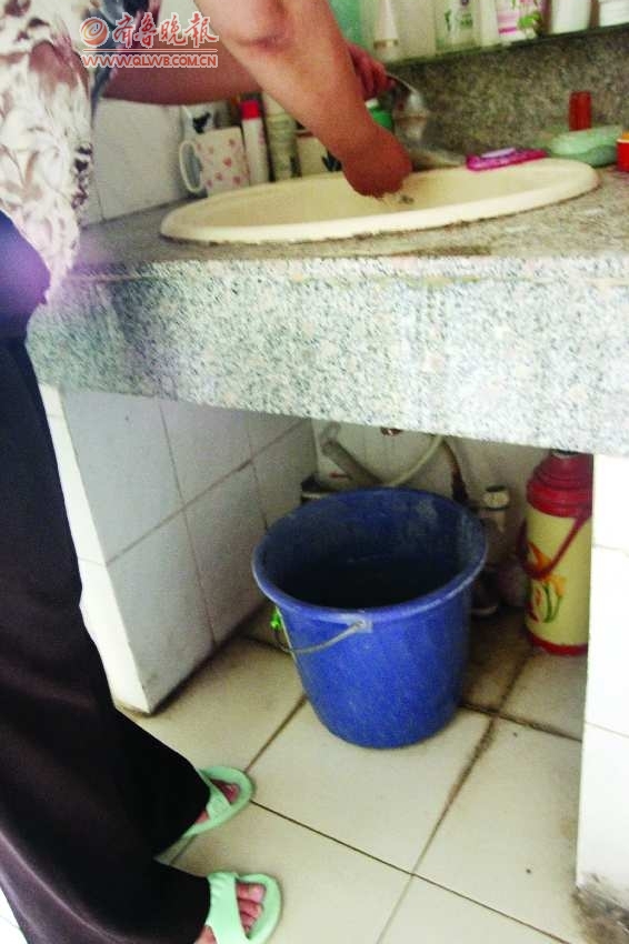 记者看到,在王女士家的洗手间里,洗手盆的下面有个蓝色的塑料桶,王女士说,“我把洗手盆的塑料下水管剪短了一些,平时洗手洗脸的水从下水管直接流到大桶里,这样节约出来的水就可以冲厕。”在王女士家卫生间的地板上,摆放着三四个盛满水的脸盆,王女士说:“这是洗过衣服的水,用它可以涮拖把、洗抹布。”在她家不宽敞的厨房里,王女士在墙角放置了一个能盛30多斤水的白色塑料大桶,并巧妙地在出水口上安装了一个压水泵,她非常自信地说:“这是我‘发明’的一个取水办法,要是停了水,一按这个压水泵,之前蓄好的水就能哗哗地流出来,和平常一样用水。”