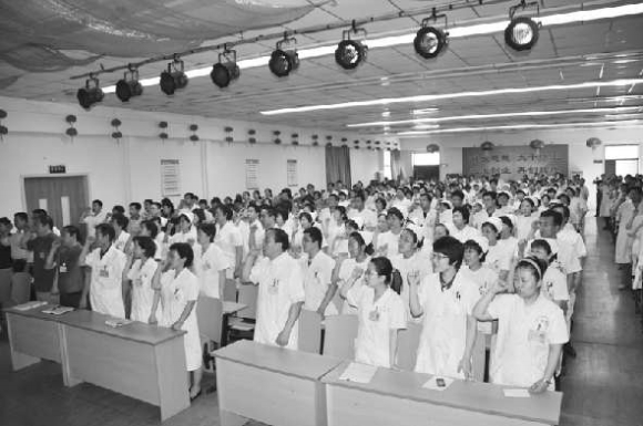 “我是一名光荣医务工作者,肩负着人民健康的重托,为实现服务好、质量好、医德好、群众满意的目标我宣誓……”6月3日,聊城市中医院“三好一满意”活动动员大会上,全院500余名干部职工面对院徽和国旗,高举右拳庄严宣誓。