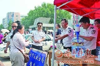 7日是高考第一天,历下区东关街道办事处城管、执法工作人员,在考点外设立“便民亭”,准备了饮水机、雨伞、2B铅笔、藿香正气水、人丹等物品,以备考生、家长不时之需。 本报记者 尹明亮 通讯员 赵亮 摄影报道
