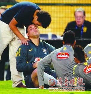 巴西国家队将在当地时间周二于圣保罗的国际足球友谊赛中对阵罗马尼亚队,同时这场比赛也将作为罗纳尔多正式的告别比赛。图为6月6日,前巴西国脚罗纳尔多的儿子罗纳德(左一)在训练后亲吻罗纳尔多。 新华社发