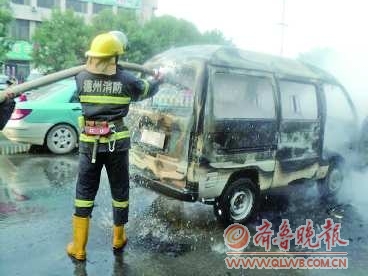 6月5日17时45分,乐陵市阜盛西路上一辆行驶中的面包车发生自燃,消防部门立即出动一辆水罐车和7名官兵赶赴现场,10分钟后大火被扑灭。据车主介绍,他行驶时闻到车后部有烧焦味,下车检查时发现已经燃烧,可能与行车时间过长致温度过高有关。