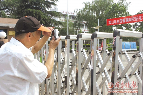 7日上午,在泰安二中考点,79岁的黄安都老人拿着相机要把孙女参加高考的情况记录下来,做成相册当作礼物送给孙女。