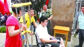 二中考生邓家伟在考前半个月时不慎小腿骨折。家长将行动不便的邓家伟送到考场警戒线处,再由考场工作人员扶邓家伟到达考场。 本报记者 李婵娟 摄