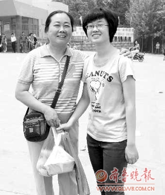 6月7日中午,在枣庄三中西校门口,结束了第一场考试之后,一位母亲给住校的女儿送来了亲手做的午餐和水果,并叮嘱女儿中午好好休息,下午正常发挥。 记者 廖杰 见习记者 马明 摄